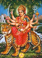 At some places, clay idols of Goddess Durga are ornamented with different weapons in her eight arms, riding a lion, with demon Maheshasur lying dead at her feet. For eight days these idols are worshipped and then immersed in a river or sea-shore on the ninth day with great fanfare.